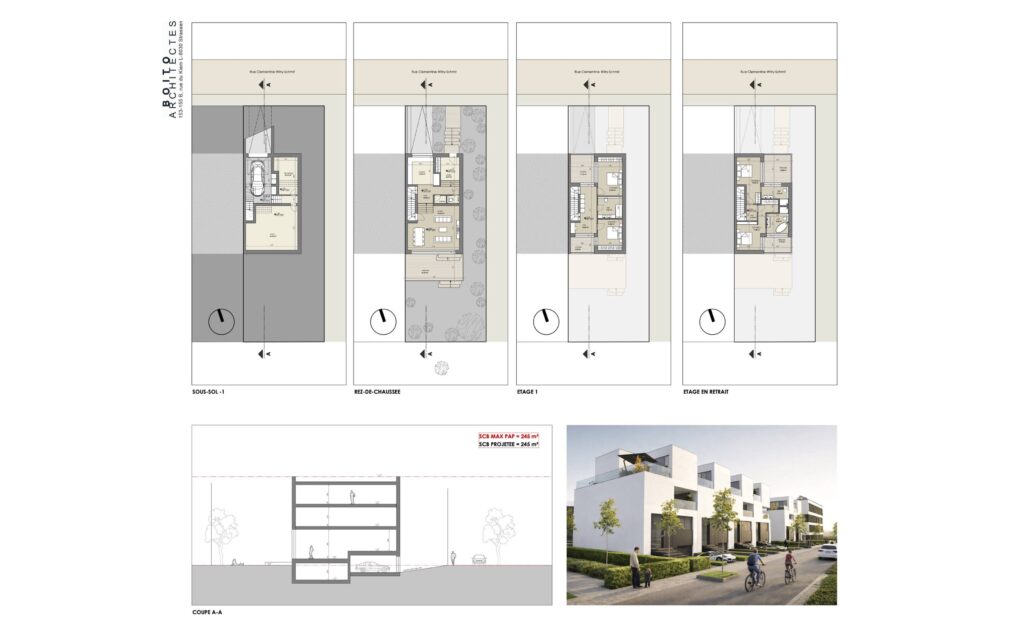 • Rez-de-chaussée + 2 étages + sous-sol de 105 m² = surface constructible totale de 245 + 105 = 350 m² bruts